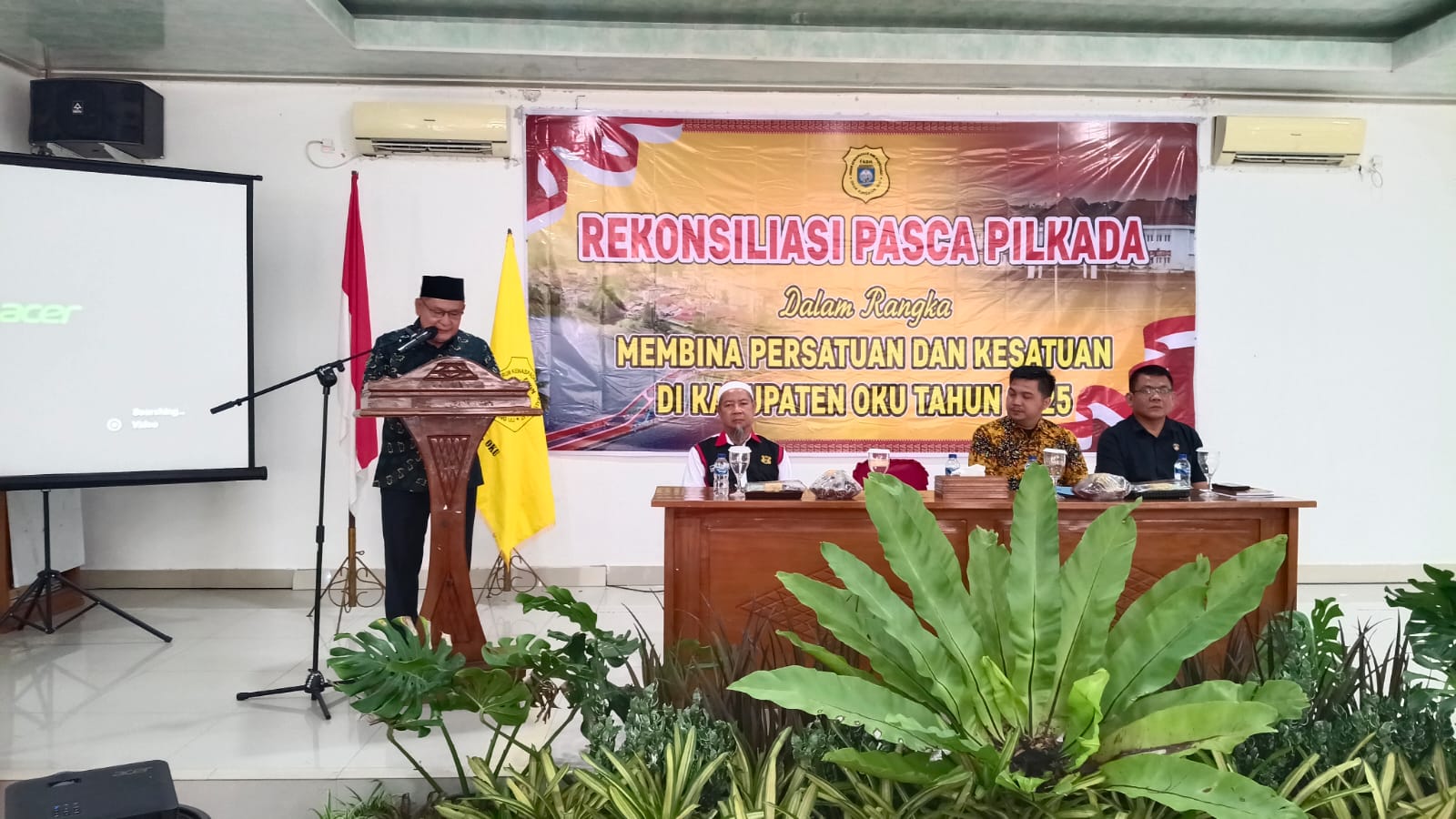Beritaokuterkini. Com | Baturaja — Forum Kewaspadaan Dini Masyarakat (FKDM) Kabupaten Ogan Komering Ulu menggelar kegiatan Rekonsiliasi Pasca Pilkada sebagai upaya memperkuat persatuan dan kesatuan masyarakat pasca perhelatan Pilkada. Kegiatan tersebut berlangsung di Gedung Sebagian Kemuning dan dibuka langsung oleh Wakil Bupati OKU, Ir. Marjito Bahri. Sabtu, (29/11/2025).