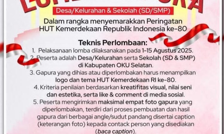 Dalam rangka menyemarakkan peringatan Hari Ulang Tahun Kemerdekaan Republik Indonesia yang ke-80 tahun 2025, Pemerintah Kabupaten OKU Selatan menggelar Lomba Gapura yang ditujukan untuk Desa/Kelurahan serta Sekolah (SD dan SMP) di wilayah Kabupaten OKU Selatan.