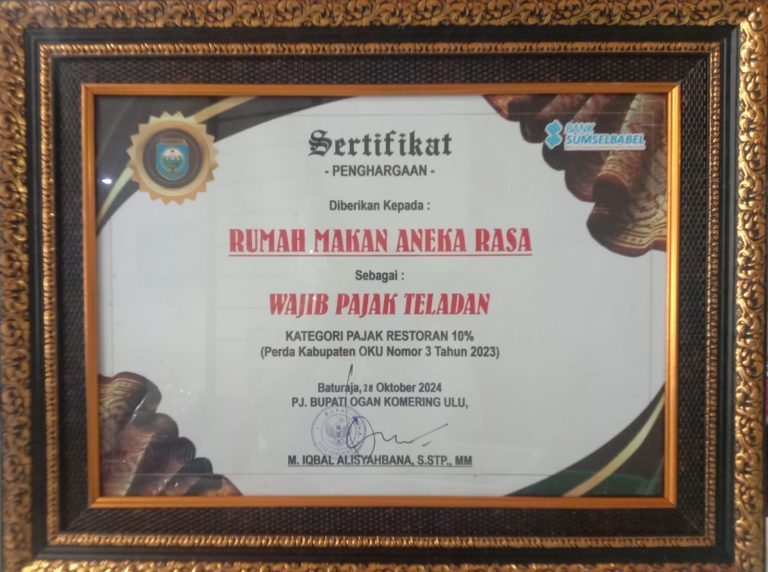 Sebagai bentuk apresiasi, Bupati Iqbal menyerahkan Sertifikat Penghargaan Rumah Makan Wajib Pajak Teladan dalam kategori Pajak Restoran 10 persen, berdasarkan Peraturan Daerah Kabupaten OKU Nomor 3 Tahun 2023.