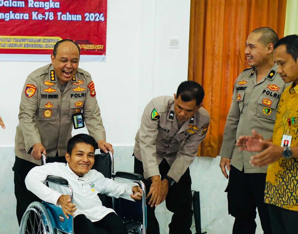 Muhammad Rahmad Hidayat, salah satu penyandang disabilitas asal Payakumbuh Sumatera Barat tak bisa menyembunyikan rasa senangnya mendapatkan bantuan kursi roda dan pelayanan kesehatan gratis dari petugas kepolisian.